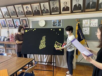 教室に大きなパネルボードが入ってくると、子ども達も興味津々の様子で、小さな歓声を上げてくれました。読み手がパネルを出す側と分かれて、3人で“たなばた”の物語を披露していただき、最後にはみんなで七夕の歌もうたいました。