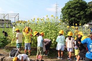 はじめは、ひまわりの周りの草とりとお水かけに頑張っていましたが、今では1年生の身長を遙かに超えて、1年生が見上げるほどになりました。逆に、ひまわりの根元で遊んでいますよ。