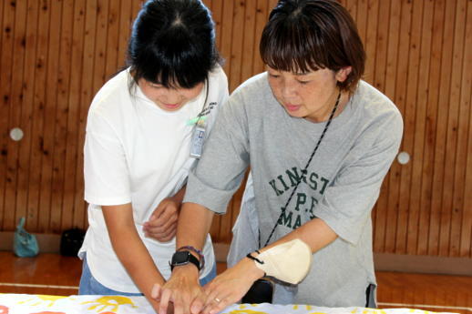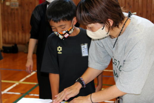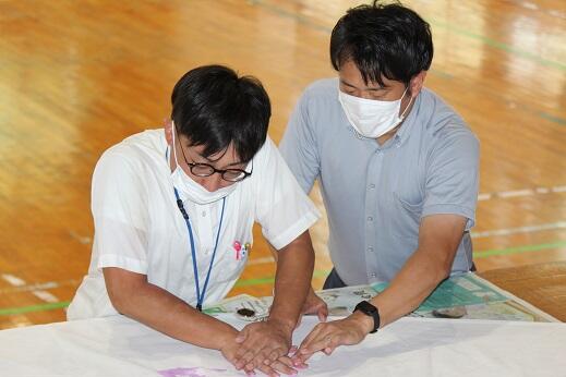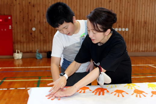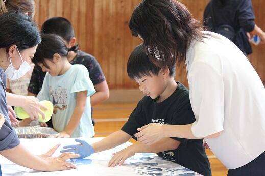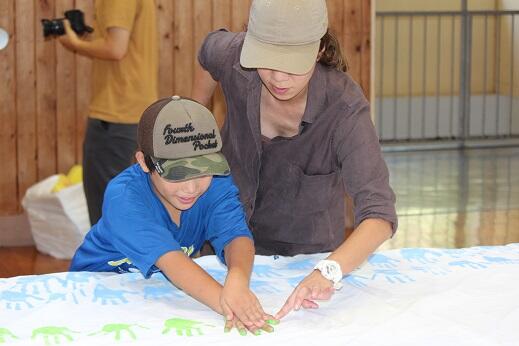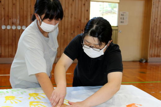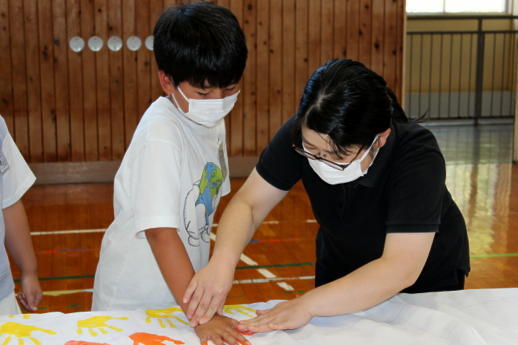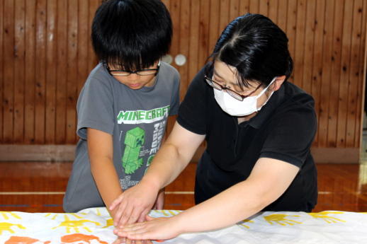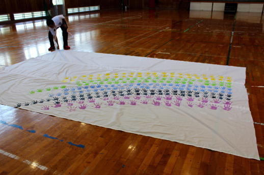 今週と来週にかけて実行委員の皆様が309人のすべての子供たちの手形を1枚の布に集める活動をしていただいています。すでに職員と1年生から3年生までの手形作成が終わりました。