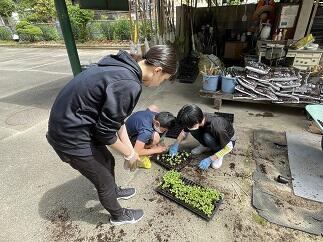 昨日、数名の若手職員と花の苗をポットへの植え替えを行いました。