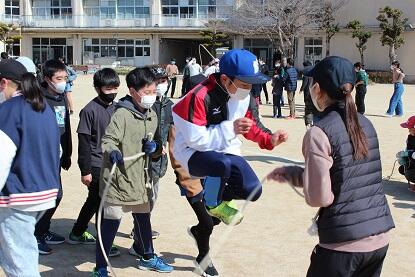 ぴょんぴょんタイムでは、各学級互いに協力しながら縄跳びをする姿が印象的でした。得意な子どもも苦手な子どももいる中で、失敗しても温かい声を掛け合う姿が随所に見られ、充実した時間を過ごしました。