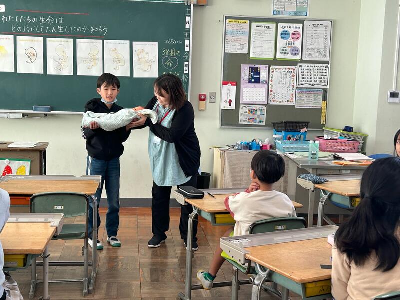 授業では、まず、体の中で赤ちゃんのもとを作る準備(二次性徴)が始まっていることを知りました。その後、DVDを視聴し、赤ちゃんがお母さんのおなかの中で育つ様子について学び、生まれた時の赤ちゃんと同じくらいの重さの赤ちゃん人形を抱っこしました。