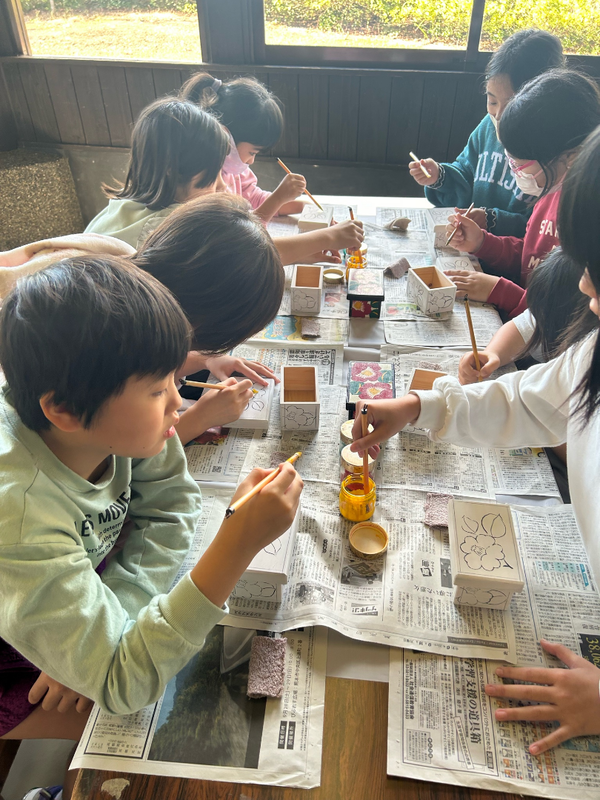 【学校の銀杏の木を使った、コースター等作成の様子】