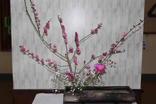 今週も田代教諭が、学校の花を生けてくれました。梅の花を上手に使った趣のある一華です。