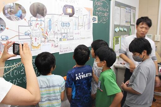 「ゴミ処理場で燃え残ったゴミはどうなるのかな」という問いをもとに、子供たちは一生懸命に予想を立て、自分がそのように考えた理由を黒板に貼られた図で説明していました。また、考えに行き詰まると、互いに学び合いながら更に高い考えを導き出そうとしていました。