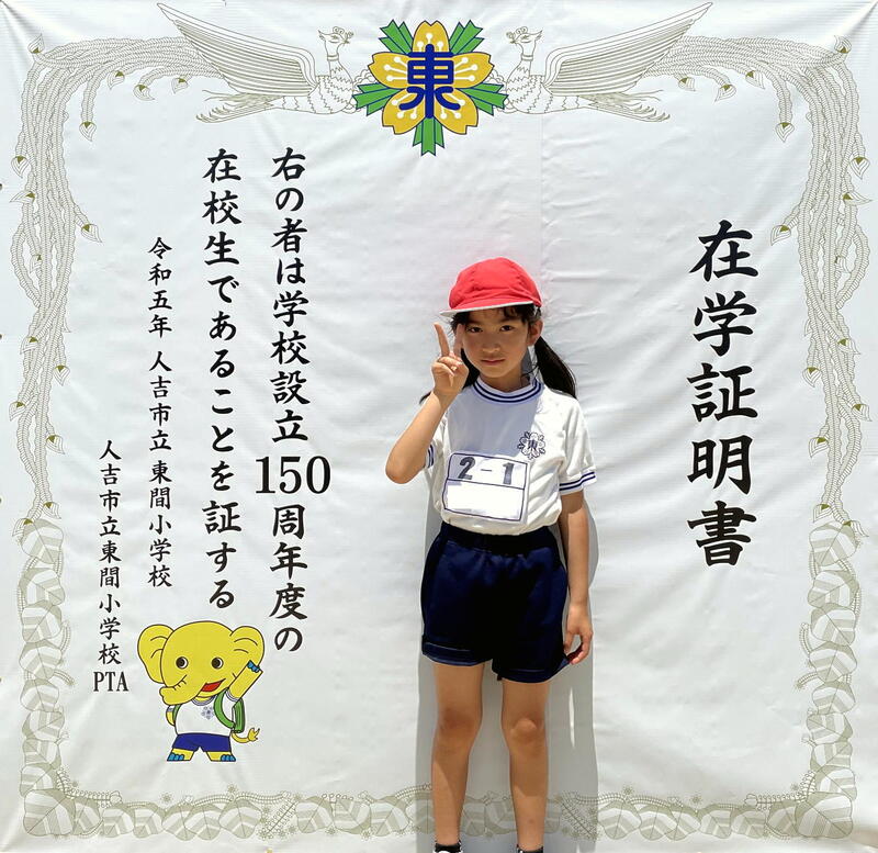運動会の最後には150周年を記念して、「150周年の在学証明書写真看板」「ランド・セルゾウ写真看板」をPTA役員の皆様に制作していただき、設置されました。