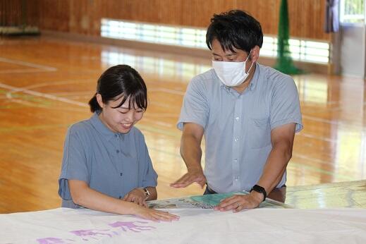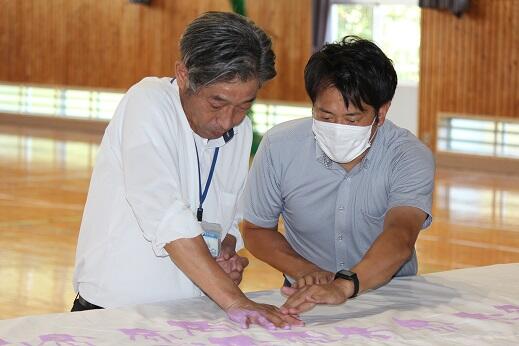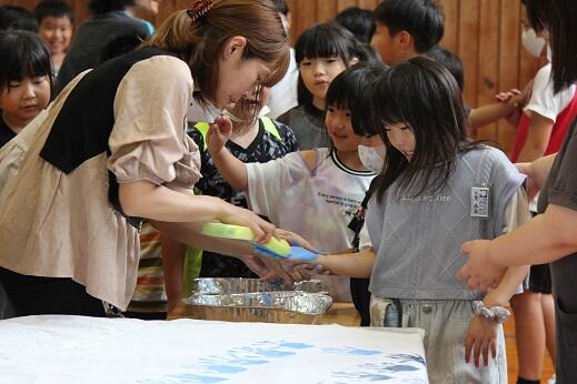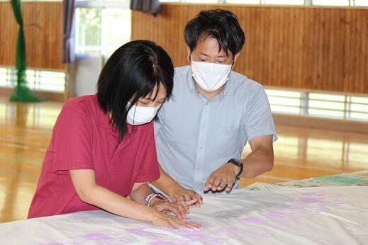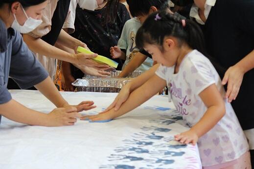 今週と来週にかけて実行委員の皆様が309人のすべての子供たちの手形を1枚の布に集める活動をしていただいています。すでに職員と1年生から3年生までの手形作成が終わりました。