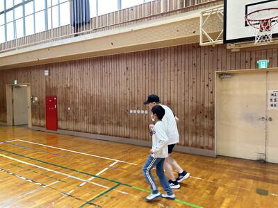 本日は雨あがりで運動場のコンディションが悪く、残念ながら体育館での伴走体験でしたが、ひとりひとりの子供とコミュニケーションを取りながら走っていただきました。
