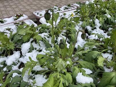 雪が積もった花壇やプランターからは、確実に春の訪れを感じることができます。もうポピーのつぼみがいっぱい頭をもたげていますよ。