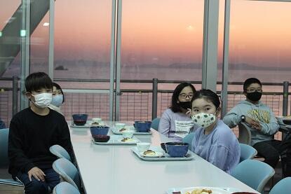 一生懸命に活動した後の夕食、どんなメニューなんでしょうね!子供たちがおいしそうに頬張る夕食の様子です。子供たちの背景が夕焼けに染まっています。