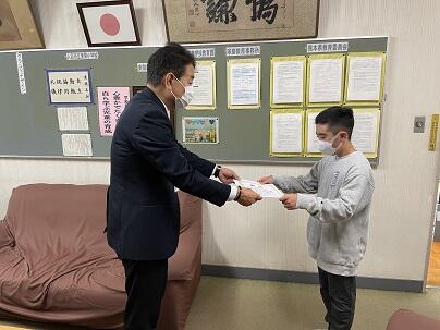 本日、人吉税務署の署長、宮原雅史 様、総務係長 緒方 裕貴 様が来校いただき、税に関する習字の表彰を行っていただきました。