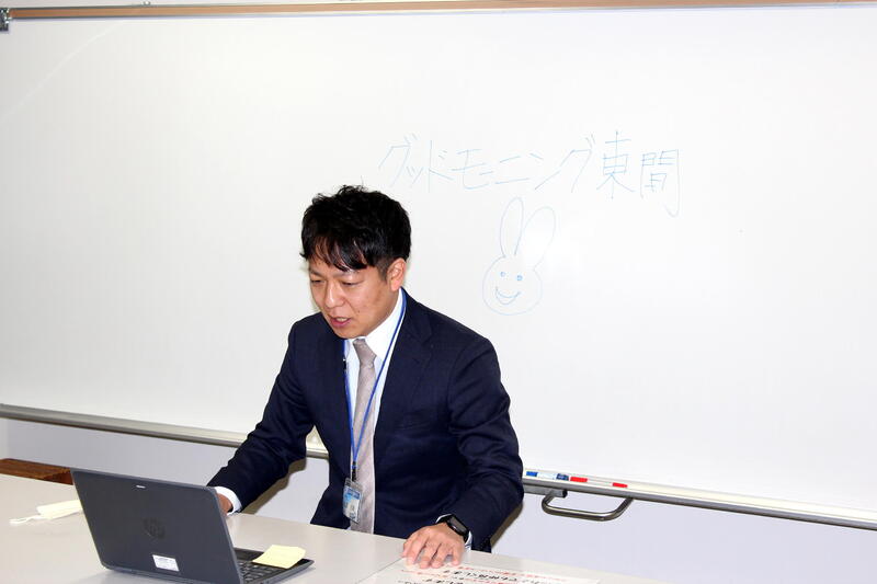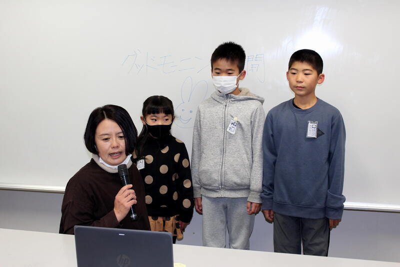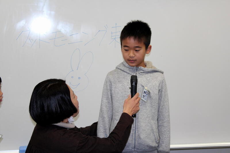 さて、今日の朝の集会は、佐藤教諭、田中教諭がプレゼンターになって、「グッドモーニング 東間小」を実施し、昨日の始業式の日に朝のあいさつが爽やかだった子供たちを代表して、3名の子供にインタビューを行いました。今回のあいさつ名人は