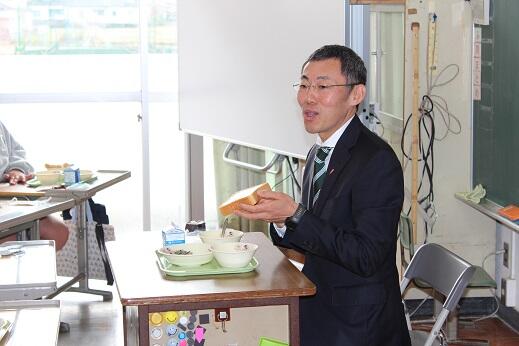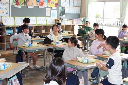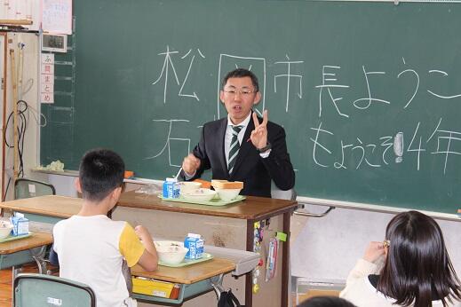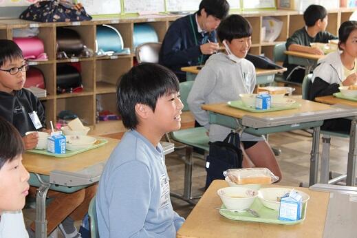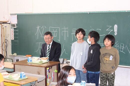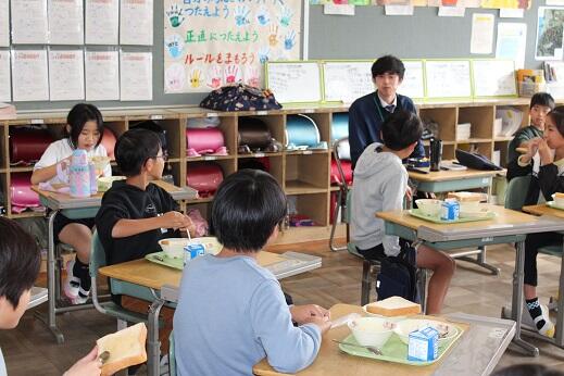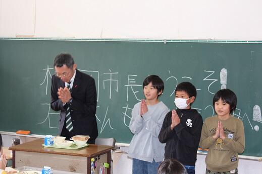 1回目は6年生がお昼をご一緒させていただきましたが、今回は4年生が給食をともにいただきました。市長の随行としてこられた石本さんも急遽、子供たちと一緒に持ってこられたお弁当を食べられることになりました。