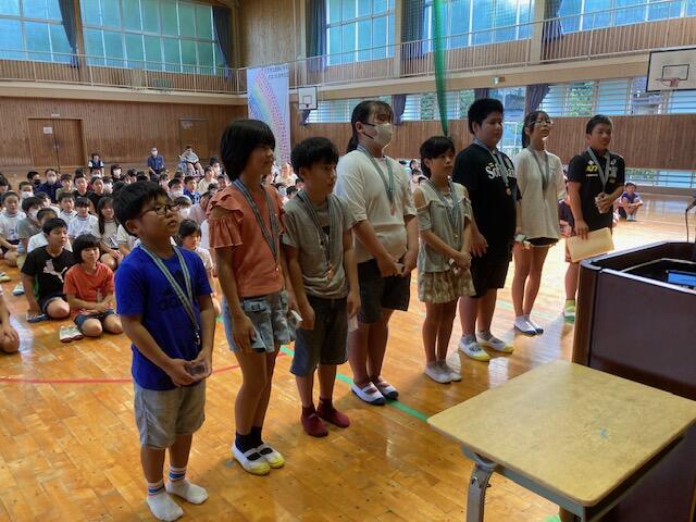9月6日(金)のあいだっ子集会では、8月18日(日)に人吉市スポーツパレスで開催されました第38回熊本県子ども会ビーチバレーボール大会の表彰を行いました。本大会において「MUNEGAWAチーム」が混合の部でみごと3位に入賞しました。表彰に加え、一人一人にメダルを授与しました。なお、この県大会には東間小校区から4チームが出場する等、子供たちの頑張りが見られた大会となりました。