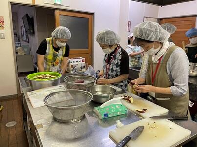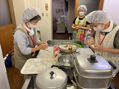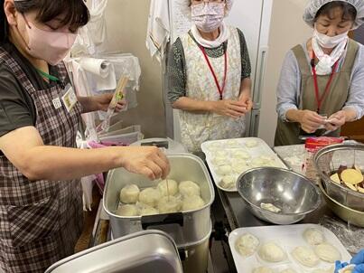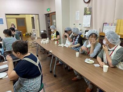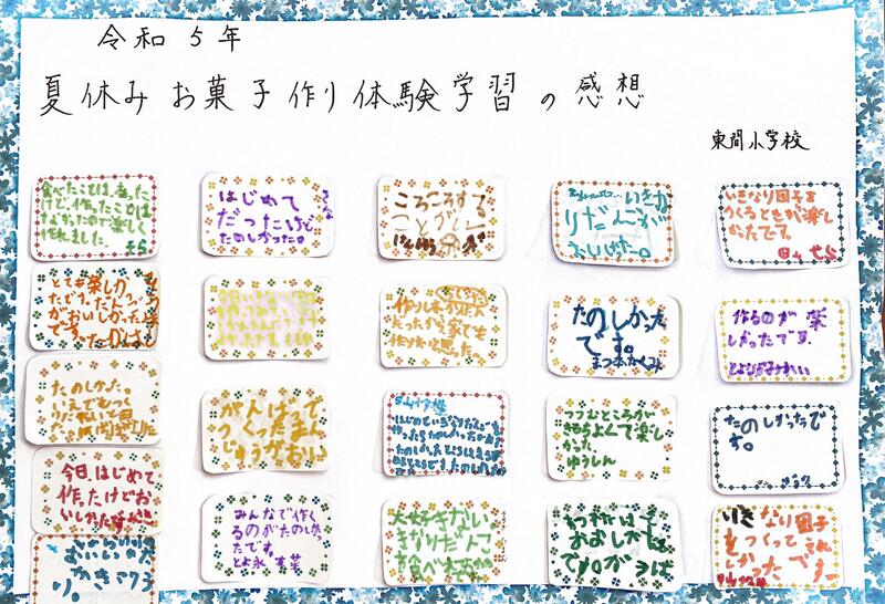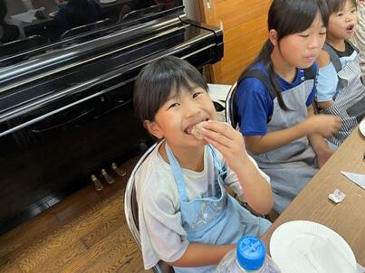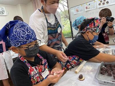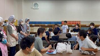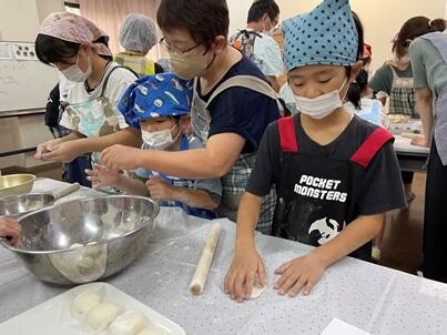 8月2日(水)に夏休み学習教室の一環としてお菓子作り体験をしました。12家族35名が参加し、学校支援ボランティアの3名、家庭教育委員の2名、食生活改善委員(すみれの会)の6名のボランティアの皆様のご協力のもと『いきなり団子』を作りました。