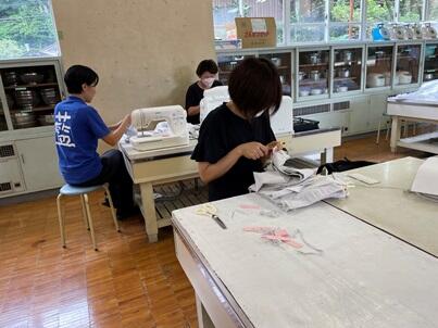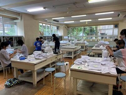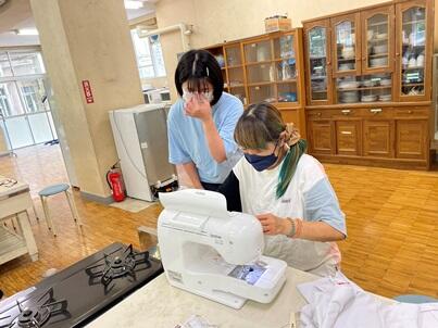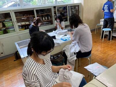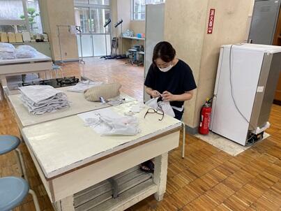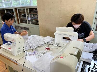 さて、先週7・10日と2日間にかけて家庭教育委員さんに給食エプロン補修を行っていただきました。ゴムの伸びた帽子やほつれが目立つエプロンなど一つ一つ丁寧に繕っていただいています。