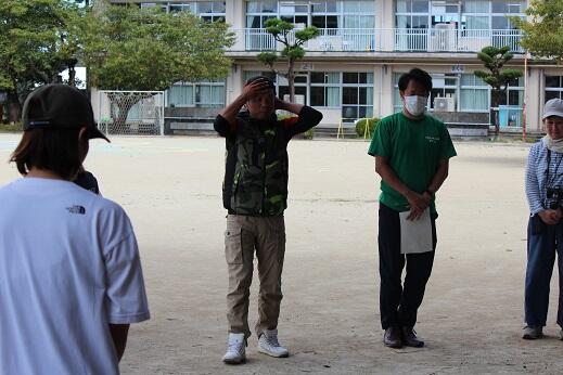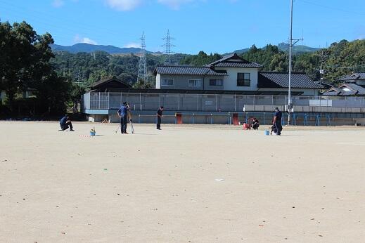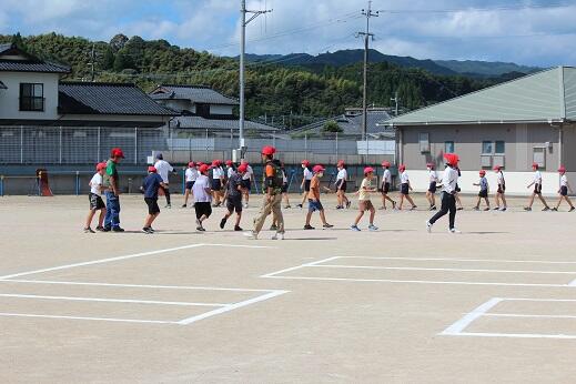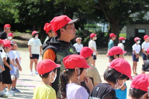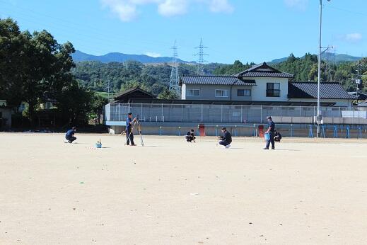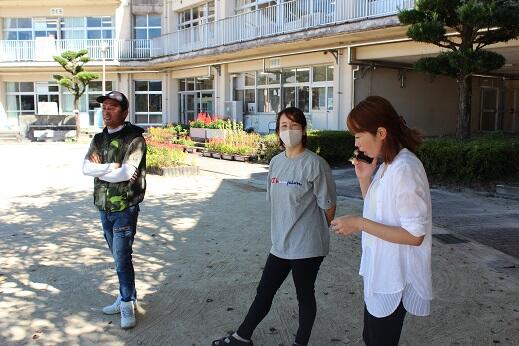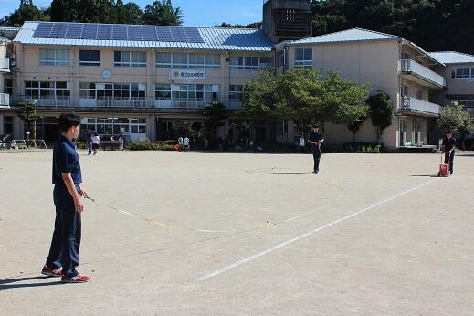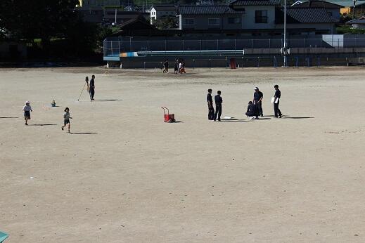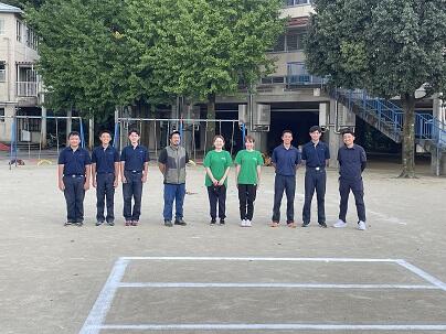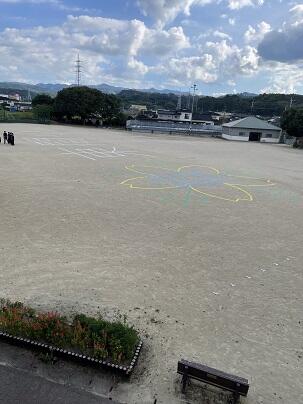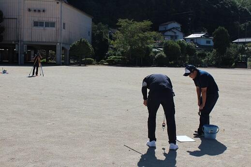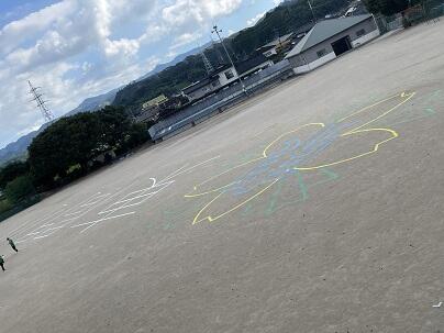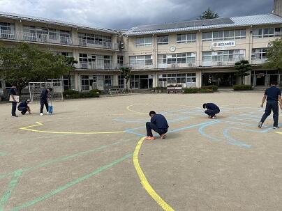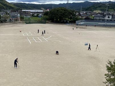 そのために、なんと球磨工業高校の建設工学科の先生と生徒さんが、朝からドローン撮影のためのライン及び校章を運動場に描いていただきました。本当に暑い中、先生と生徒さんが夕方までかかり、素晴らしいラインを引いていただきました。