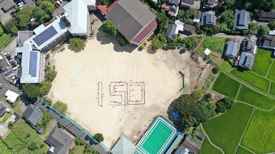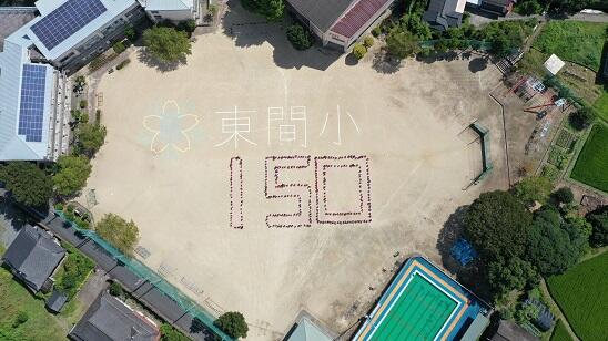 昨日、球磨工業高校のみなさんにひいていただいたラインをもとに、ドローンによる空中撮影を行いました。早朝より150周年実行委員の皆様、そしてPTAの皆様にご協力をいただき、中尾様が操縦するドローンにより見事に人文字を作成することができました。