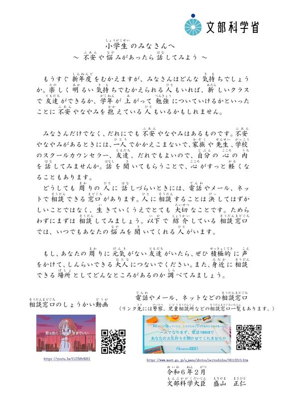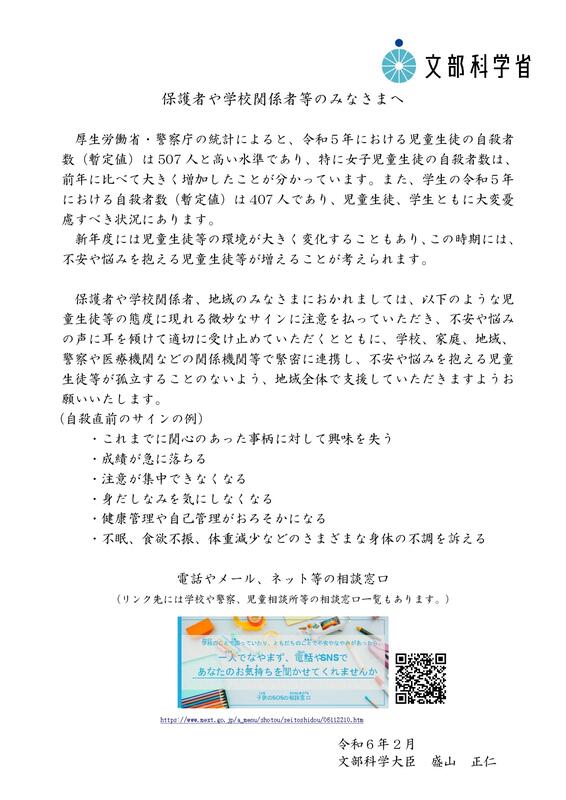 県からのお知らせ 最新の投稿順 最新の投稿順 古い投稿順 コメントの多い順 10件 1件 5件 10件 20件 50件 100件 熊本県立ゆうあい中学校(夜間中学)について 熊本県立ゆうあい中学校(夜間中学)「入学希望者説明会」について県よりお知らせがありました。 以下のURLよりご覧ください。 https://sites.google.com/g.bears.ed.jp/yuai-jhs 自殺予防に係る児童生徒や学生等への文部科学大臣メッセージ