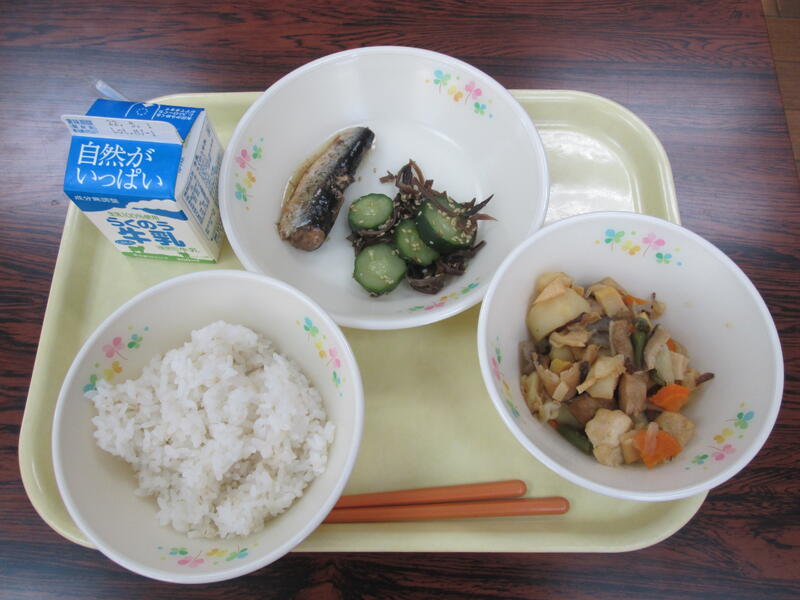 本日、9月1日(木)は、防災の日です。給食も防災を意識し、乾物を多く使った献立を提供していただきました。今日の献立は、麦ごはん、高野豆腐の味噌汁、イワシのおかか煮、防災サラダ、牛乳でした。