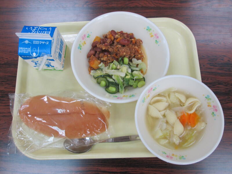 チリコンカンとは、ひき肉と玉ねぎ、トマト、ピーマン、豆、チリパウダーなどを加えて煮込んだメキシコ料理由来の「アメリカの郷土料理」だそうです。多くの食材を使った栄養いっぱいの献立でした。今日も美味しくいただきました。感謝!