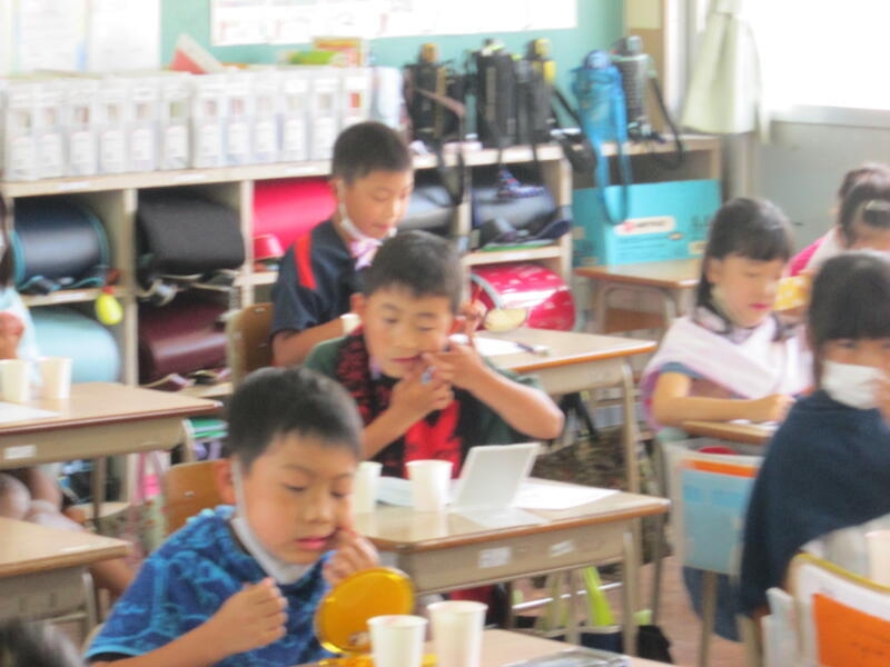 4月12日(火)、今年度初めての給食をいただきました。1年生にとっては、小学校で食べる初めての給食です。コロナ禍ですので食事をする時は黙食。1年生も約束を守って黙って食べていました。