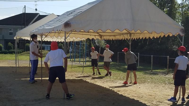保護者の方には、入退場門設営や万国旗付け、杭打ちなどをしていただき、子どもたちも明日に備えて早めに下校することができました。