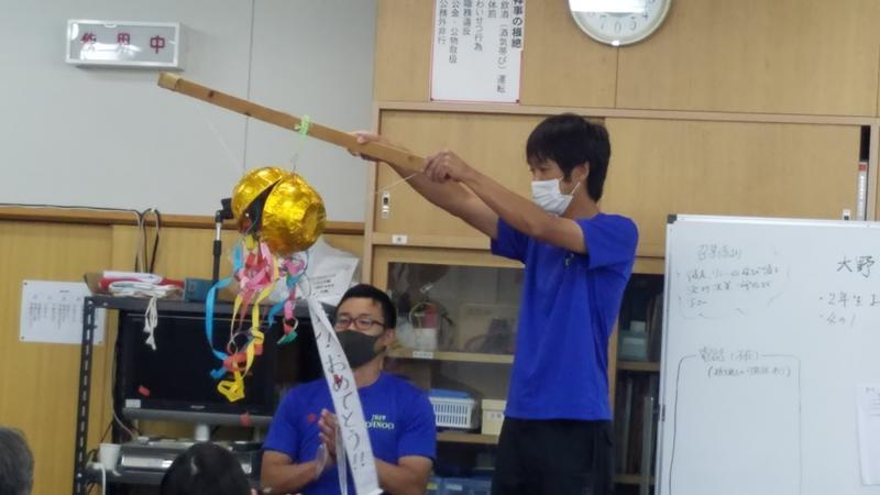 運動会の全日程が終了後、職員室で教職について2年目、初の体育主任としてこれまで頑張った豊田先生を手作りくす玉でねぎらいました。
