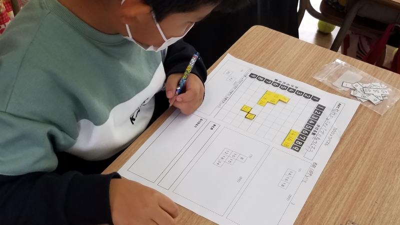 子どもたちは、何も書いてない九九表と様々な形のピースに興味津々。早くパズルに取りかかりたくて目を輝かせていました。