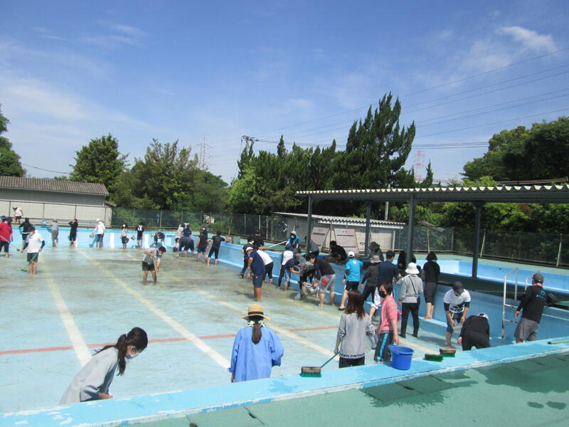 5月28日(土)、PTA役員(三役、地区、体育委員)、有志及び職員で、プール掃除を実施しました。総勢70名で一気に掃除し、大小プールが見違えるほど綺麗になりました。30日(月)には、高学年の児童が更衣室やプールサイド等を掃除し、完了しました。御協力いただいた保護者の皆様、本当にお世話になりました。心よりお礼申し上げます。