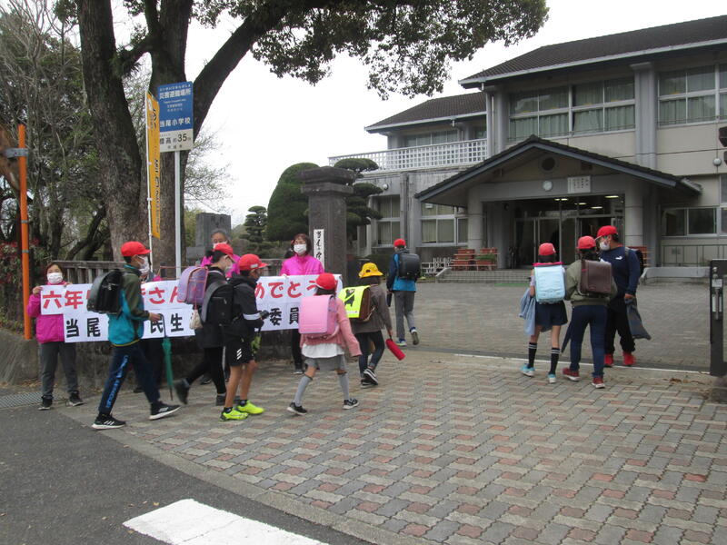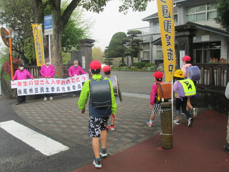 4月12日(火)、昨日の入学式から一夜明け、ピカピカの一年生がランドセルを背負って登校してきました。本日は、民生委員児童委員の皆様方が横断幕を掲げて一年生を温かく迎えてくださいました。地域の皆様に見守られ当尾の子供たちは、本当に幸せです。ありがとうございました。