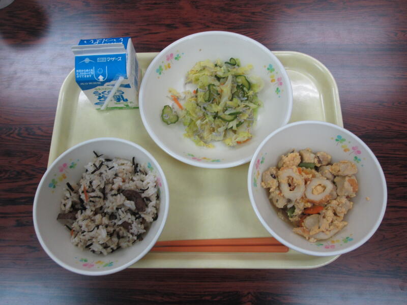 3月23日(水)、本日は本年度最後の給食でした。献立は、ヒジキご飯、高野豆腐の卵とじ、ごまジャコサラダ、牛乳でした。6年生は、小学校生活最後の給食です。感謝していただきました。美味しかったです。