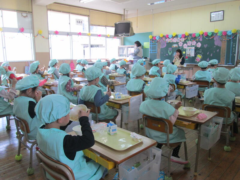 4月12日(火)、今年度初めての給食をいただきました。1年生にとっては、小学校で食べる初めての給食です。コロナ禍ですので食事をする時は黙食。1年生も約束を守って黙って食べていました。