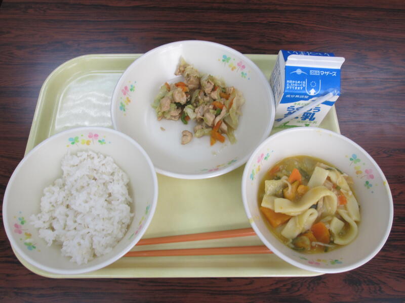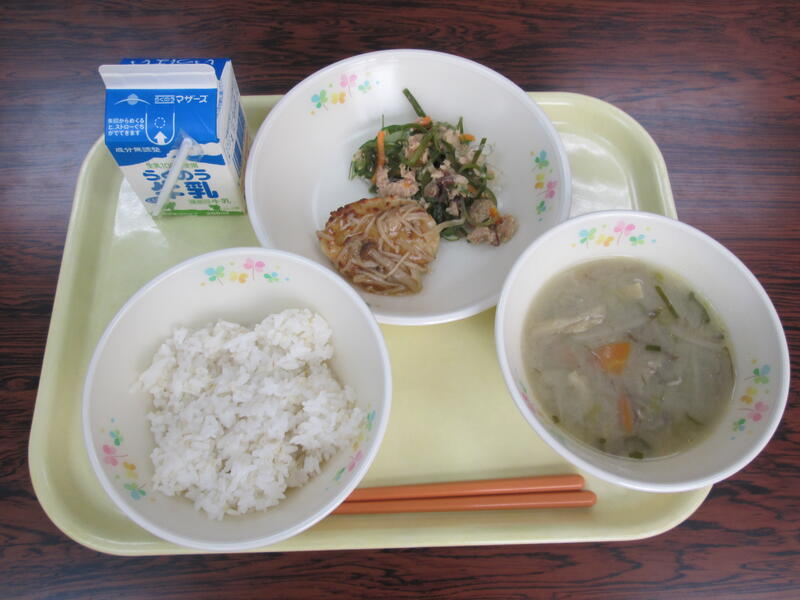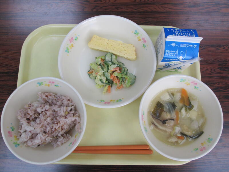 さて、今日の給食は、雑穀ご飯、里芋の味噌汁、厚焼き卵、胡麻和え、牛乳でした。雑穀ご飯もいいですね~。今日も美味しくいただきました。感謝!