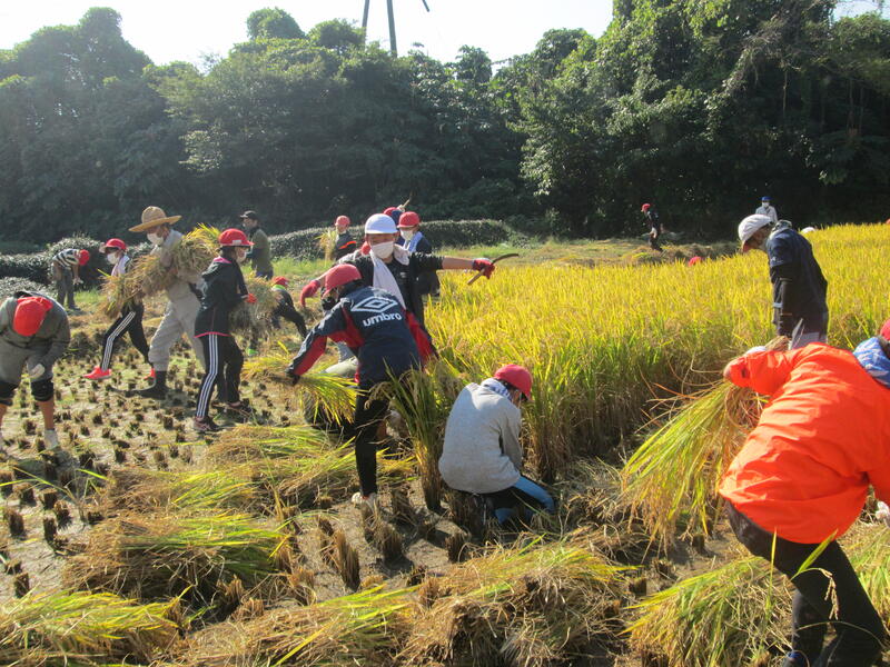 10月27日(水)、地域の方々のご協力のおかげで本日、稲刈りを無事に行うことができました。貴重な体験をさせていただき、本当にありがたいです。秋晴れの中、黄色く実った稲穂が鎌で刈られていく光景は、その感触と共に子供たちの記憶に残っていくと思います。