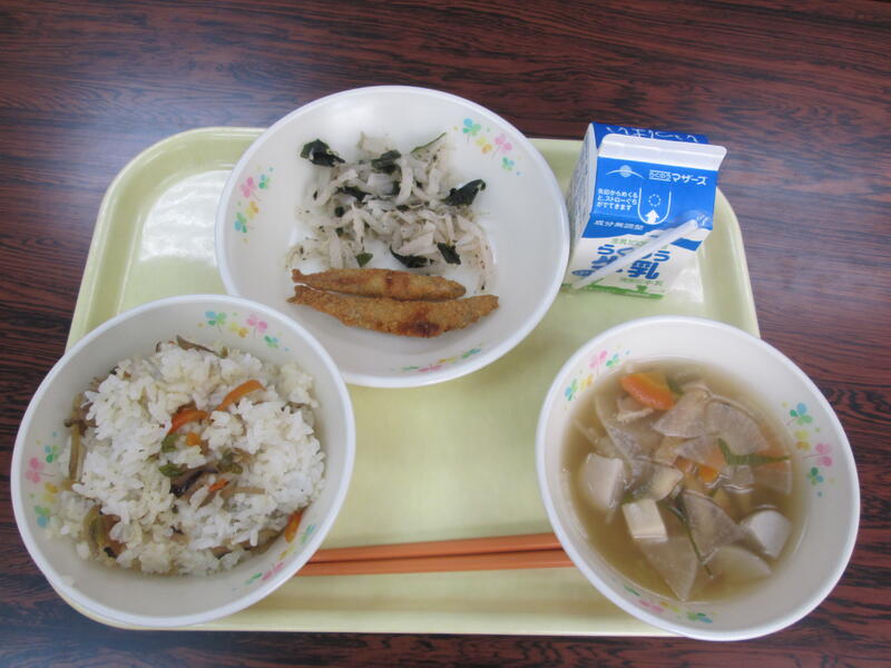 10月28日(木)、今日の献立は、五目御飯、イチョウ葉汁、きびなごフライ、大根とジャコの梅肉和え、牛乳でした。多くの食材でつくられた給食です。栄養いっぱいで有難いなあと思いました。今日も美味しくいただきました。感謝!