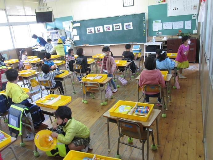 4月15日から始まった臨時休校で、初めての登校日です。子どもたちは、いつもより早めの登校でした。登校してすぐの1年生の教室をのぞいてみると、