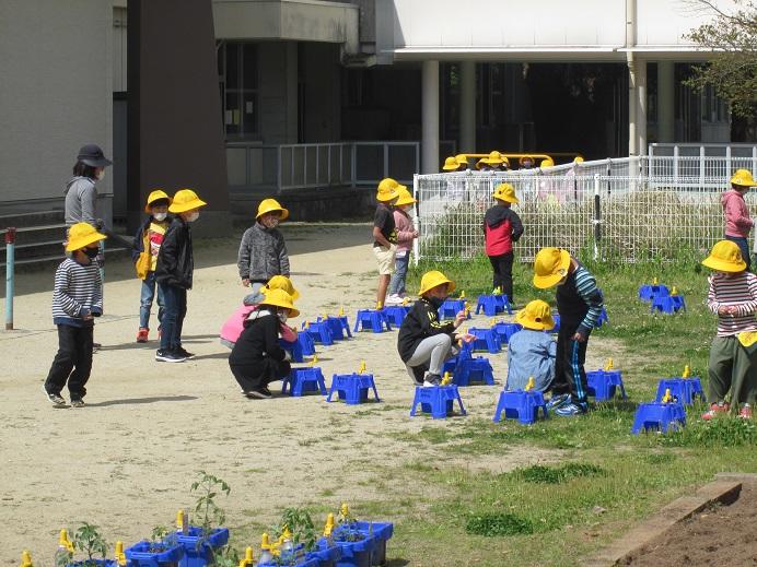 2年生は、野菜の苗を植え付けていました。トマトやキュウリなど自分で持ってきた苗です。