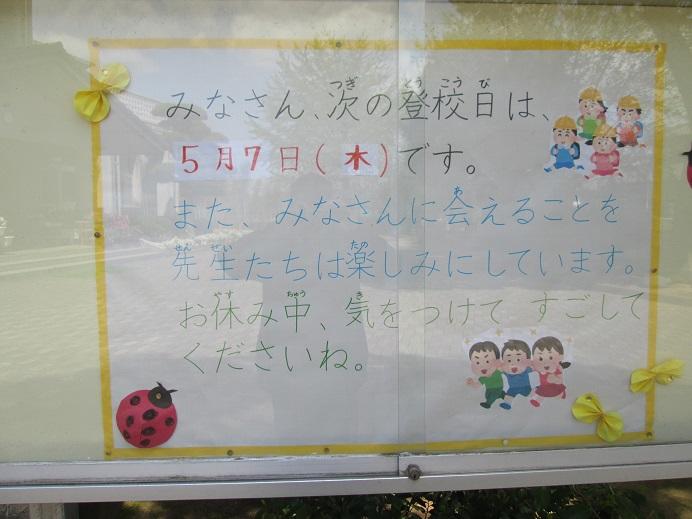 さて、はなまる連絡帳でお知らせしたとおり、次の登校日は、5月7日(木)になりました。本格的な学校再開とはまだいかないかもしれませんので、今後学校よりのお知らせなどを確認されてください。