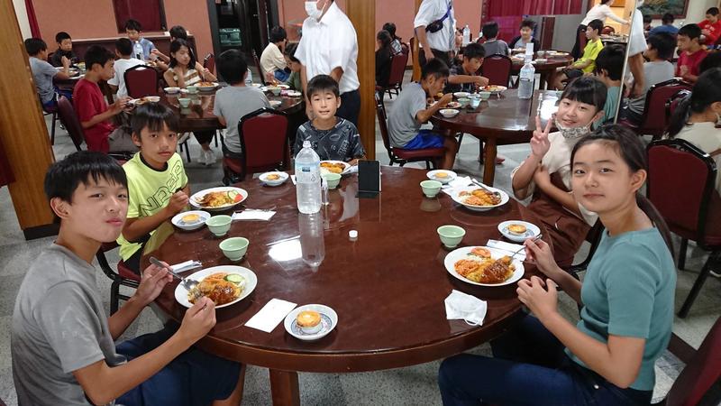 広い食事会場で大きなテーブルに4人ずつ。ゆったりと食事を楽しんだ子どもたちでした。