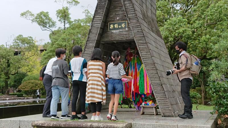 平和祈念像の前で、みんなで心を込めて作った千羽鶴を捧げ平和を祈りました。