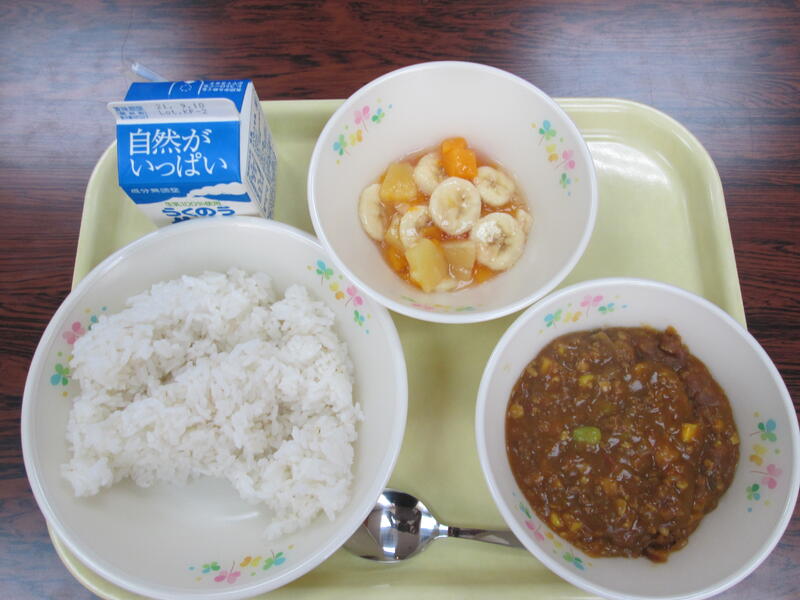 40日の夏休みが終わり、今日から前期後半がスタートしました。今日の献立は、キーマカレー、フルーツミックス、牛乳でした。新しくなった給食センターから新しい食缶に入った給食が運ばれてきました。今日も美味しくいただきました。感謝!