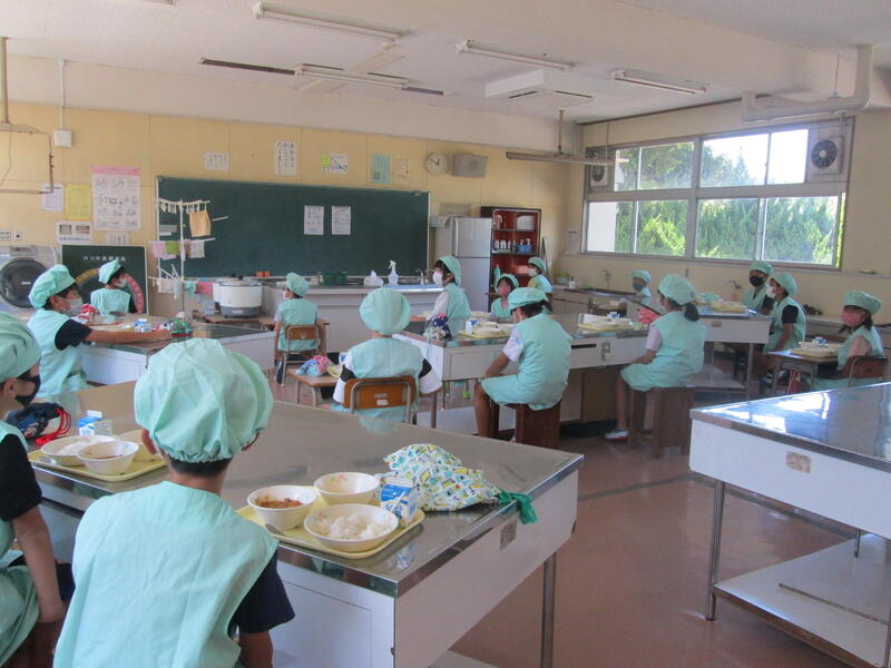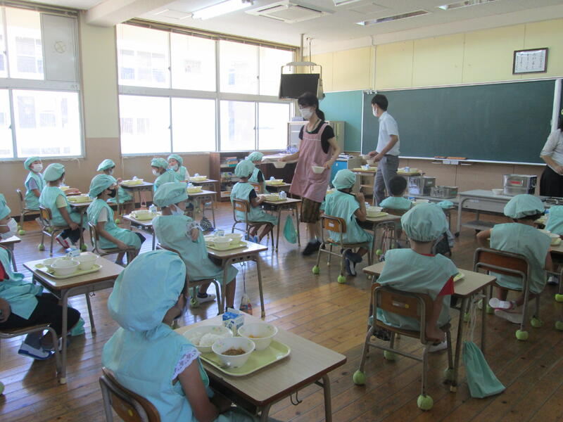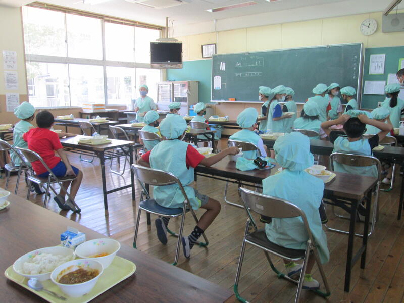 感染症対策の一つとして、教室内が特に密になっている1・4年の児童は、それぞれの教室と生活科教室、家庭科室、算数教室の3か所に分散して給食を食べることにしました。空き教室や職員数の関係で、この3学級のみの対応となりました。すべての学級を見て回ったところ、どのクラスも「黙食」をしてくれています。しばらくは、窮屈なところもありますが、みんなで心を一つにして乗り切っていきます。