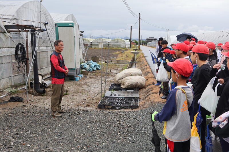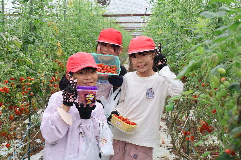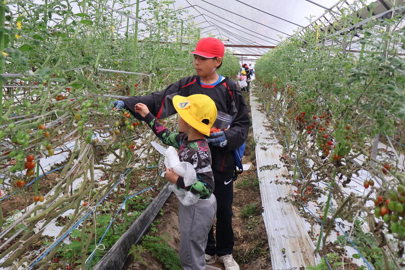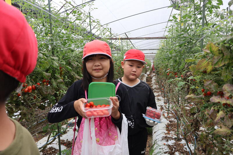 この取組は20年以上も続いているそうです。藤田さんには、わざわざ子供たちのために収穫前のミニトマトを確保し、提供していただきました。2年生以上の子供たちは毎年やっていますのでタッパーや袋の準備は万全です。入れ物いっぱいにミニトマトを詰めて大満足でした。