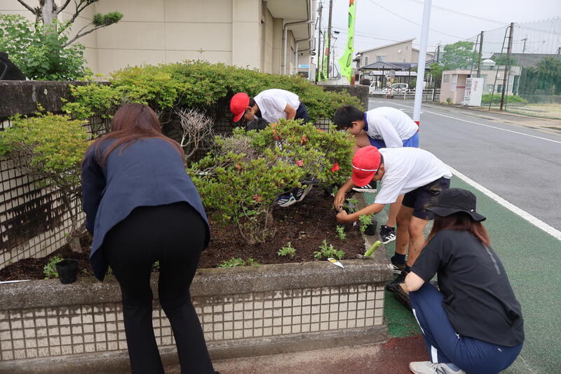 あいにくの雨でしたが、正門、南門の花壇と玄関のプランターに夏の花の苗植えを頑張ってくれました。