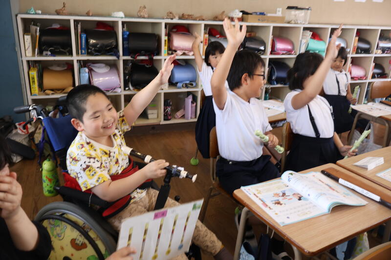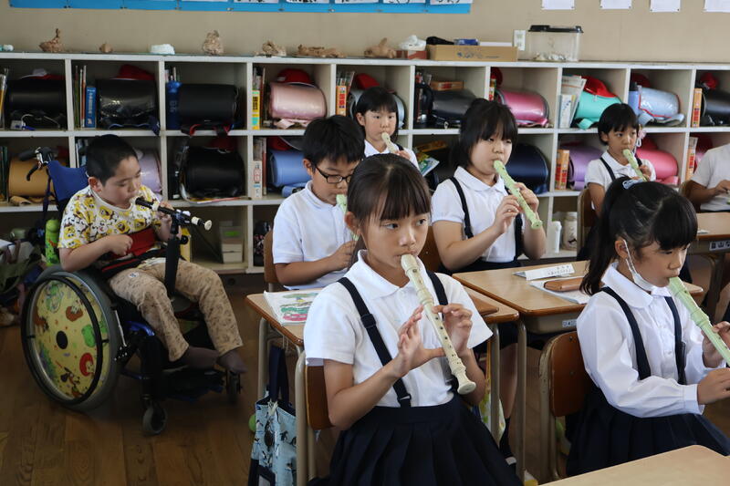 昨日、本校と松橋支援学校の3年生同士で交流授業を行いました。音楽の時間にリコーダーの練習を一緒に頑張りました。