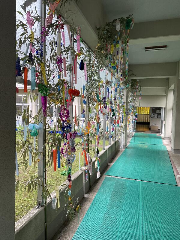 児童昇降口に笹を設置し、全校児童で七夕飾りを作っています。