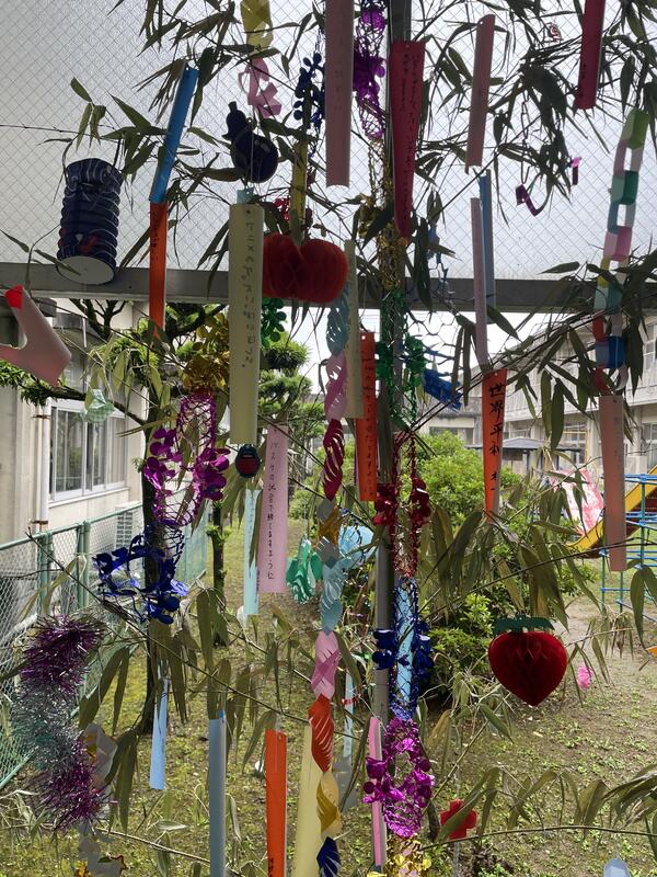 飾りや短冊で色鮮やかな七夕飾りが出来上がっています。
