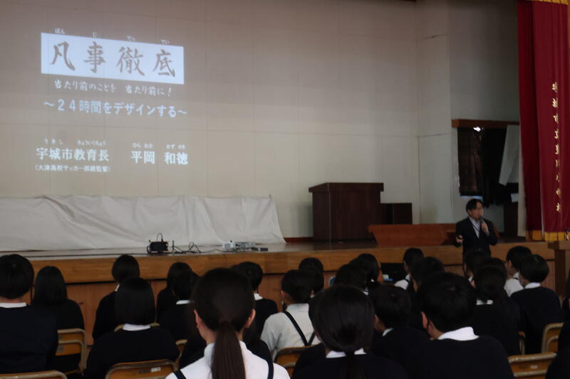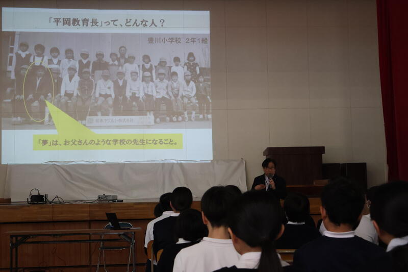 3月4日(水)宇城市教育長 平岡 和徳 先生による教育講演会を開催しました。4年生以上の児童、教職員、保護者、地域の方々を対象に「年中夢休~24時間をデザインする」という演題でお話をしていただきました。平岡教育長は豊川小学校の出身でもありますので小学校の頃の話から大津高校サッカー部のテクニカルアドバイザーとして60名以上のプロサッカー選手を育てた話まで多岐にわたる内容でした。