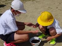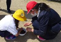 6年生は、1年生とペアになって、種まきの仕方を教えました。